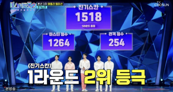 진기스칸은 메들리 팀 미션에서 2 등을 차지합니다. 팀 미션에서 뽕드림이 1위를 하고 있었는데 마지막 팀인 진기스칸이 아슬아슬하게 그에 못 미쳤네요!