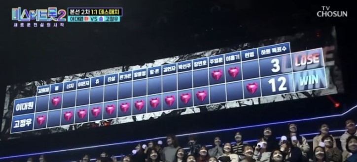 이대원 씨도 참 얼굴도 잘생겼는데 노래도 참 맑게 잘 불러요~ 고정우 씨는 미친 감성을 잘 녹여낸 가창력으로 열창해서 결국 승리를 거머쥐었습니다. 12:3으로 고정우 씨 승리! 역시 꽤 큰 격차였네요.