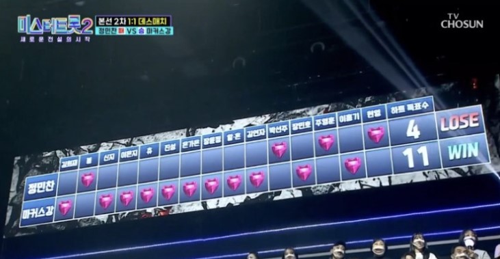 어휴 비주얼이 남다른 정민찬 씨~ 역시나 남다른 의상과 화려한 무대로 무대감을 뿜뿜 뿜어냈지만 마커스강의 저음~ 아 저는 왜 이렇게 저음에 약한지ㅋㅋ 저음으로 열창한 마커스강의 승리! 11:4라는 꽤 큰 격차였어요.