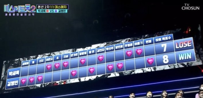 웃는 거 너무 귀여운 거 아닌가요? 나도 모르게 같이 미소 짓게 만드는 매력의 황민호 군, 엄청난 꺾기와 노래에 담긴 한의 반전 매력을 가진 친구라 저의 최애 중에 하나죠~ 우리 야성의 매력을 가진 박건우 씨의 퍼포먼스도 좋았지만 안타깝게도 15:0으로 완패를 했네요. 황민호의 완승~