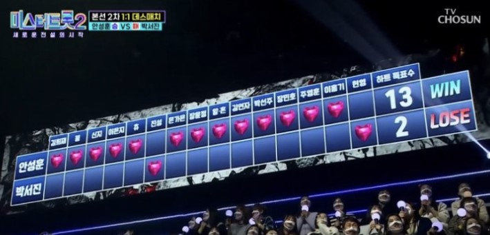 정통파 안성훈 씨는 그냥 지금 당장 앨범 내고 가수 하셔도 될 거 같아요.ㅎㅎ 인기투표의 강자 박서진 씨 많은 기대를 했는데, 열창에 비해 포스가 떨어지는 느낌이 살짝 들더니 안타깝게도 결국 13:2로 안성훈 씨의 승리!