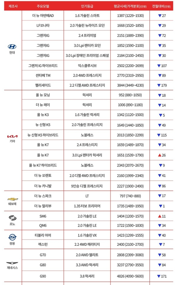 | 브랜드 | 차종 모델, 등급 | 중고 가격 분포 (만원) | 평균가(만원) / 전월대비 |
